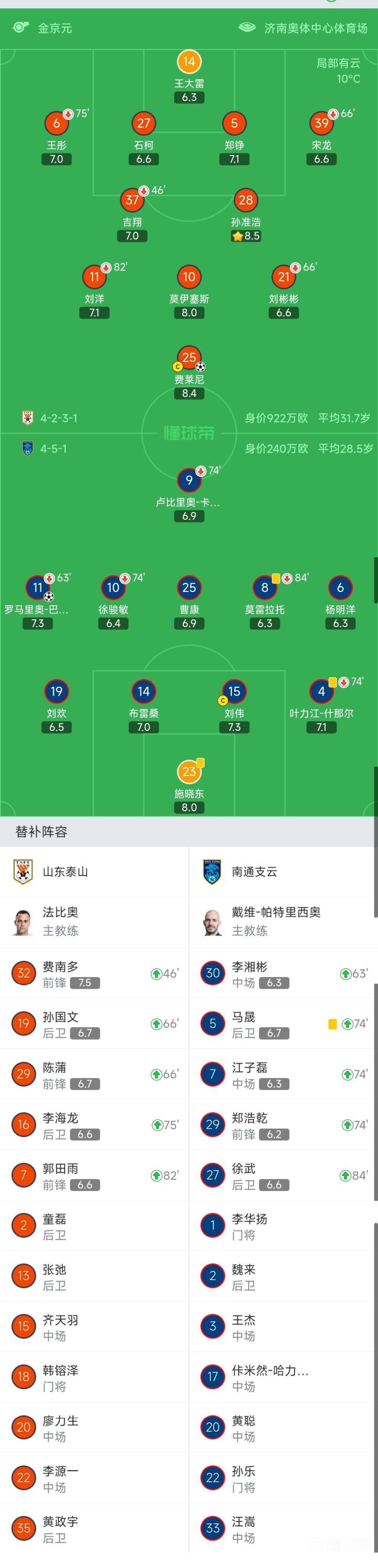 山东首发:14-王大雷、39-宋龙(66′29-陈蒲)、27-石柯、5-郑铮、6-王彤(75′16-李海龙)、37-吉翔(46′32-费南多)、28-孙准浩、11-刘洋(82′7-郭田雨)、10-莫伊塞斯、21-刘彬彬(66′19-孙国文)、25-费莱尼