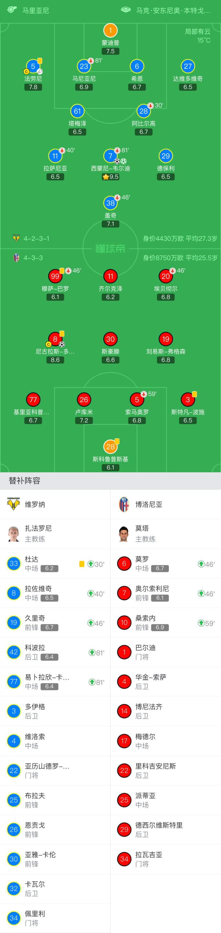 维罗纳首发:1-蒙迪普、5-法劳尼、6-希恩、23-马尼亚尼(81'42-科波拉)、27-达维多维奇、28-阿比尔高(30'33-杜达)、61-塔梅泽、11-拉萨尼亚(40'8-拉佐维奇)、7-西蒙尼-韦尔迪(81'77-卡卡里)、29-德保利、38-盖奇(46'19-久里奇)