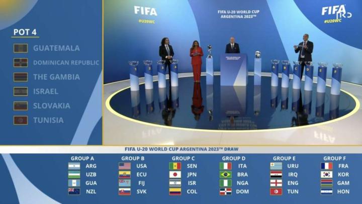 2023阿根廷u20世界杯分组出炉 A 阿根廷 乌兹别克斯坦 危地马拉 新西兰 B 美国 厄瓜多尔 斐济 斯洛伐克 C 塞内加尔 日本 以色列 哥伦比亚 D 意大利 巴西 尼日利亚 多米尼加 E 乌拉圭 伊拉克 英格兰 突尼斯 F 法国 韩国 冈比亚 洪都拉斯 比赛将于2023年5月20日至6月11日在阿根廷举行(原定于在印度尼西亚进行,由于巴勒斯坦以色列冲突以及宗教对立,印度尼西亚拒绝接收以色列队,因此FIFA取消印度尼西亚举办权及参赛资格)