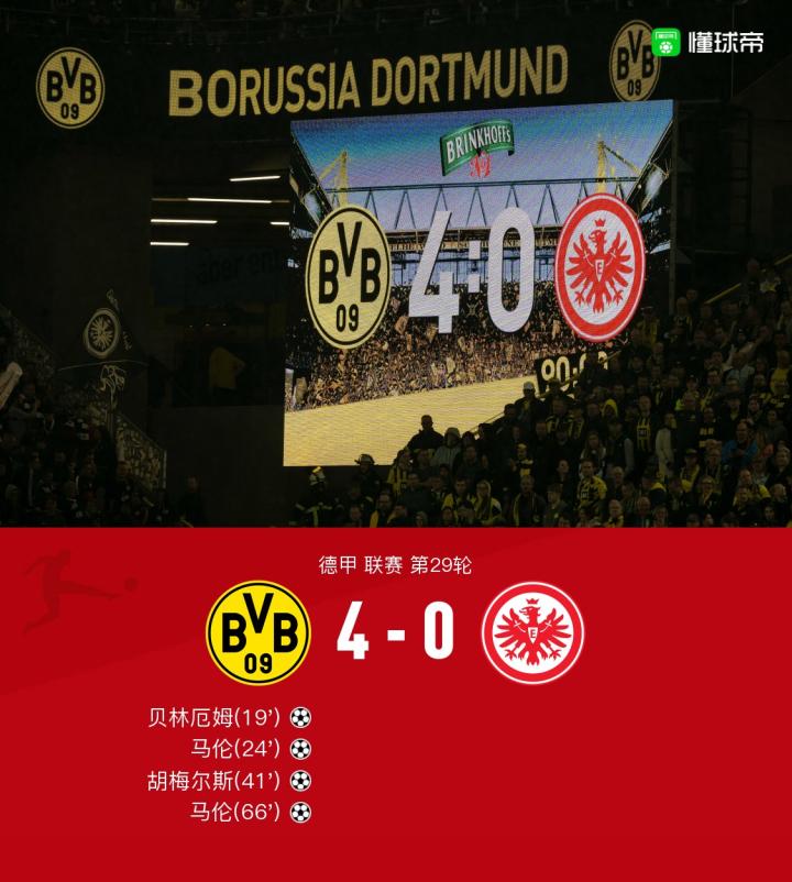【多特4-0法兰克福超越拜仁登上榜首,马伦双响,贝林厄姆建功】