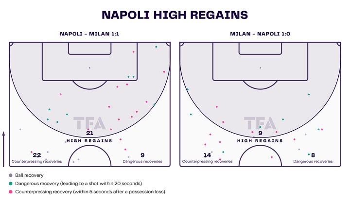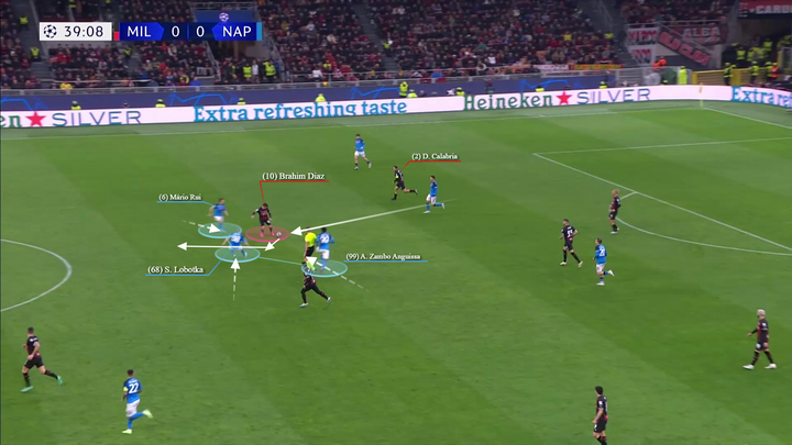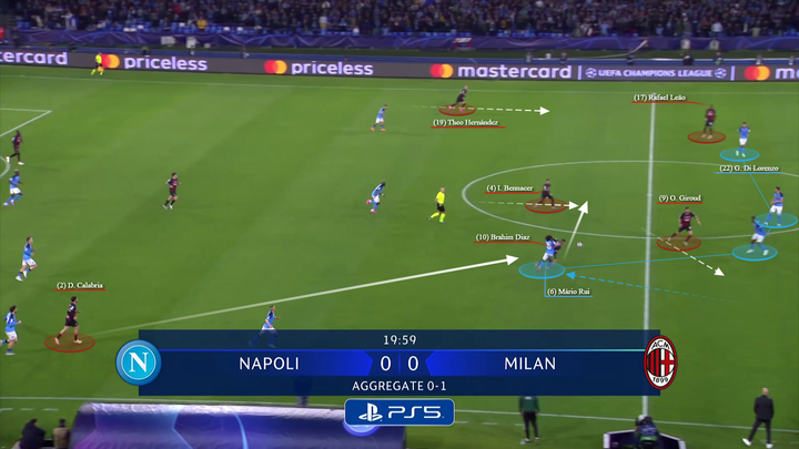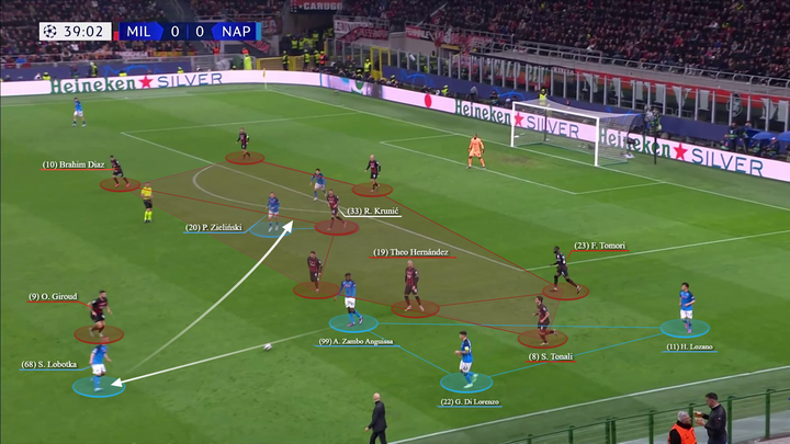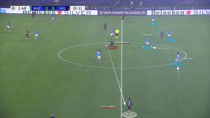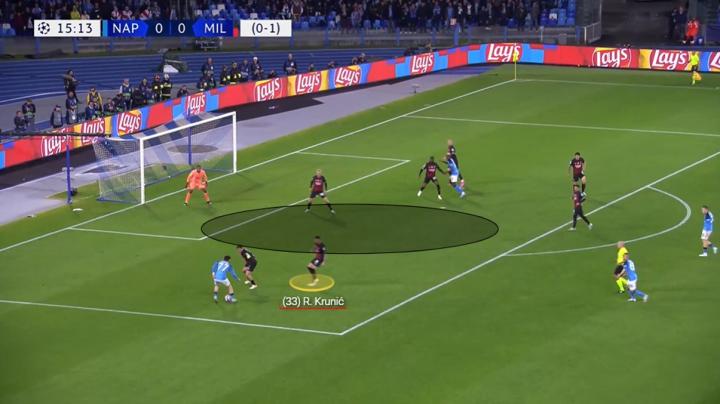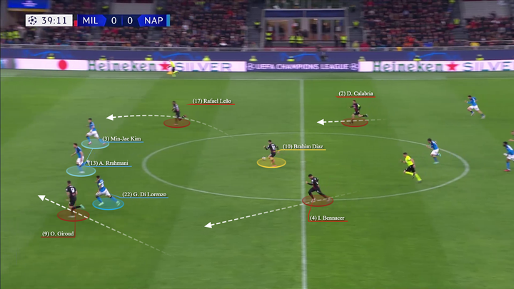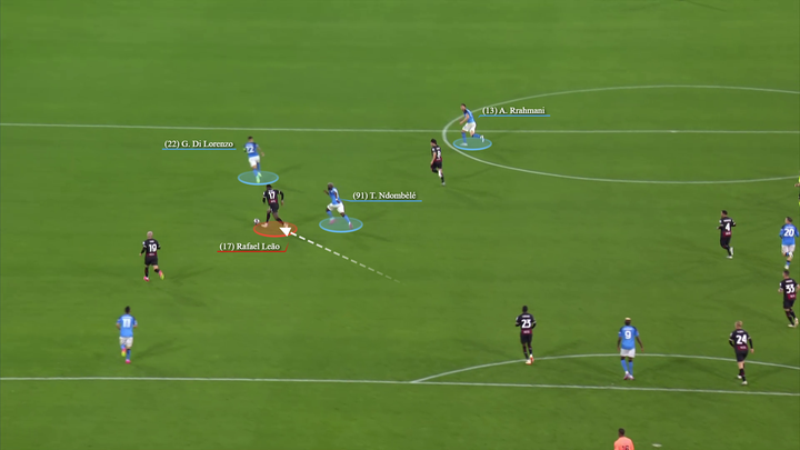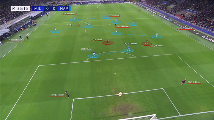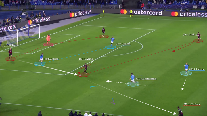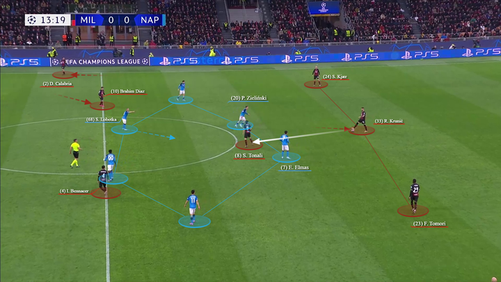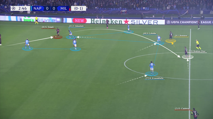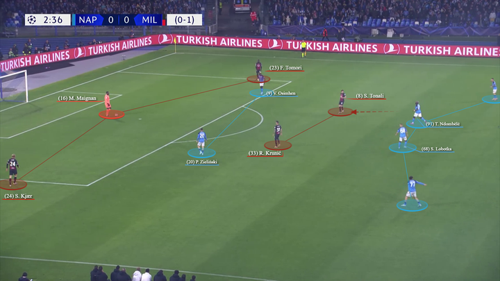托纳利倾向于回撤到左侧(同特奥和莱奥一起对两名那不勒斯球员在侧翼制造人数优势),而克鲁尼奇则保持在中路,面对那不勒斯第一条防线的严密防守,而另一名压迫球员则压得更高。