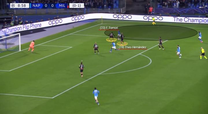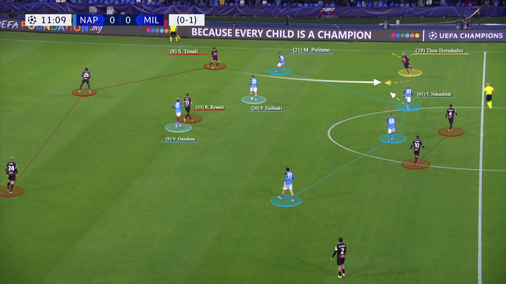 米兰充分利用了托纳利在左路的机动性,在他和奥斯梅恩或者泽林斯基之间制造了距离。这导致那不勒斯第二条防线的一名球员上前向托纳利施压,然后让米兰很好地利用了身后的空间。
