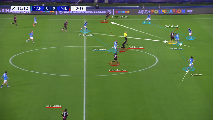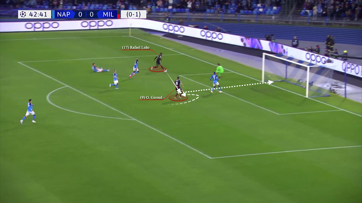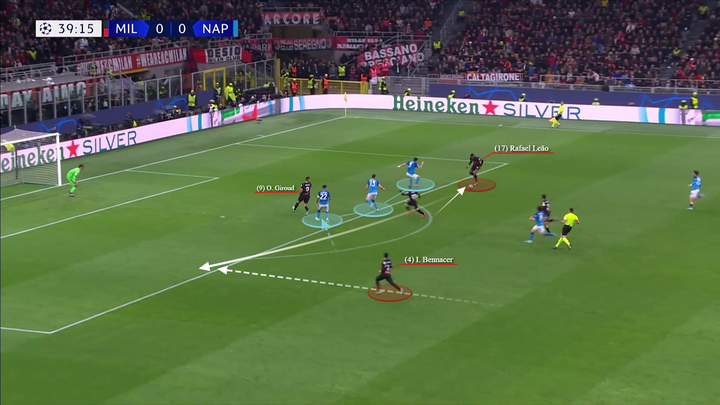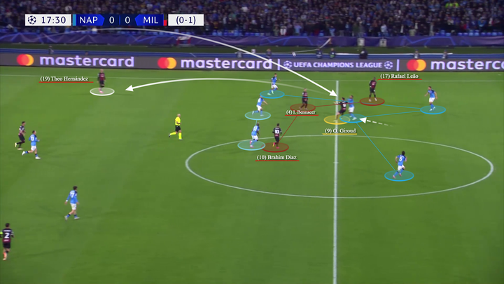 然后特奥将球传给吉鲁,吉鲁将球做给左侧的莱奥。贝纳赛尔、布拉欣和莱奥在位置上都在那不勒斯的中场球员的身后。