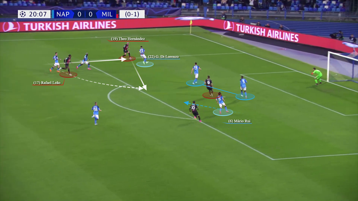 米兰利用4-2-3-1阵型布置了中区拦截,除了吉鲁之外,其他人都回来了,而莱奥经常会帮助特奥盯防他身后套边插上的那不勒斯边后卫,或者只是站住良好的防守位置。