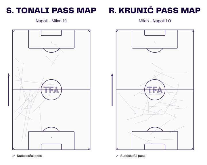 托纳利在第二回合和克鲁尼奇在第一回合的传球图表明,后者倾向于中路进攻,而托纳利则专注于左侧进攻。