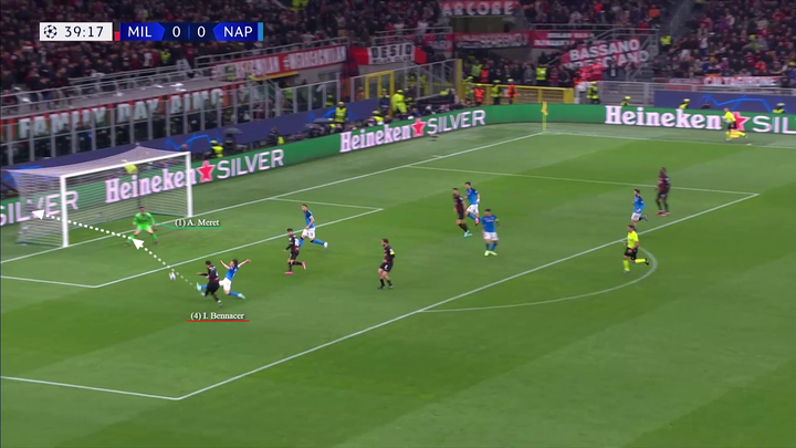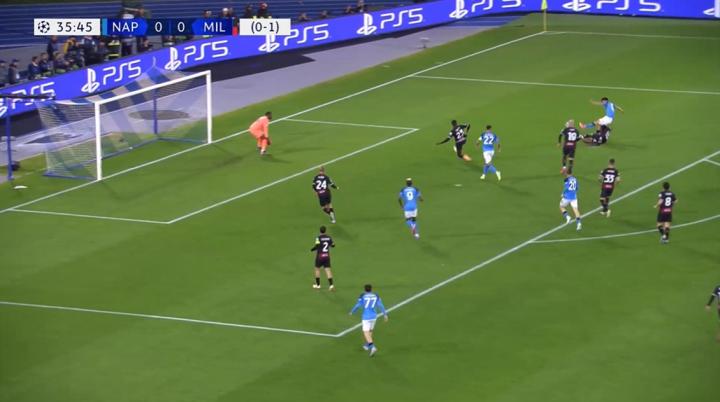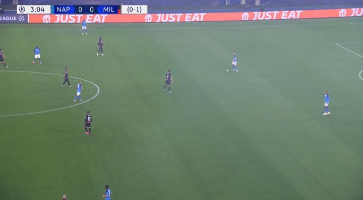 幸运的是,卡拉布里亚接到球并直接将球传到布拉欣和贝纳赛尔所在的位置。恩东贝莱和洛博特卡现在都在米兰的身后,导致那不勒斯防线不得不持续后退。