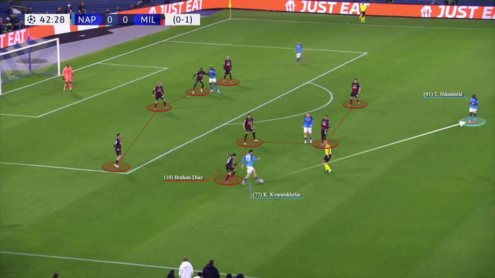在马拉多纳球场,克瓦拉茨赫利亚在米兰两条线非常紧密地时候选择内切,防守球员将奥斯梅恩看得十分牢。克瓦拉茨赫利亚将球传给了恩东贝莱,后者没将球停好。