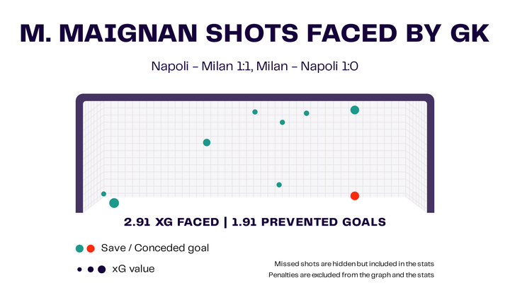 不仅仅是莱奥和布拉欣表现非凡,迈尼昂在两场比赛中都成为了英雄,还扑出了克瓦拉茨赫利亚的点球。如下图所示,他在两场比赛中遇到了2.91的预期进球情况下仅丢了一球,这还不包括点球。