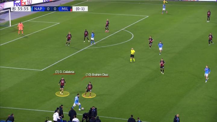 然后布拉欣将球转移到卡拉布里亚套上的右侧,而那不勒斯的左后卫鲁伊被自己的后防线给带走。这让卡拉布里亚有足够利用的空间,极具威胁地跑向了最后三区。