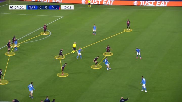 尽管那不勒斯在比赛初期占据了优势,但米兰从未真正处于任何危险之中。从一开始就很明显,在无球阶段米兰并不打算高位压迫,尽管他们在几周前的联赛中对阵那不勒斯时是这样做的。