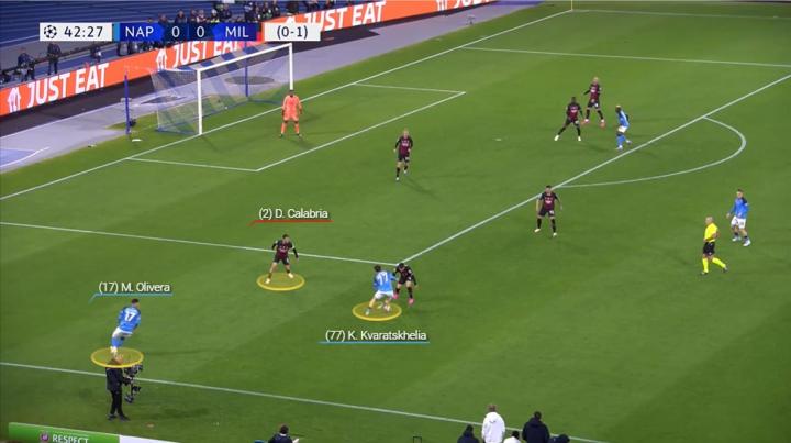 克鲁尼奇在那不勒斯第一条防线身后接球后,克瓦拉茨赫利亚被迫上前施压,而洛博特卡则想要在球传给卡拉布里亚之前加速赶到。