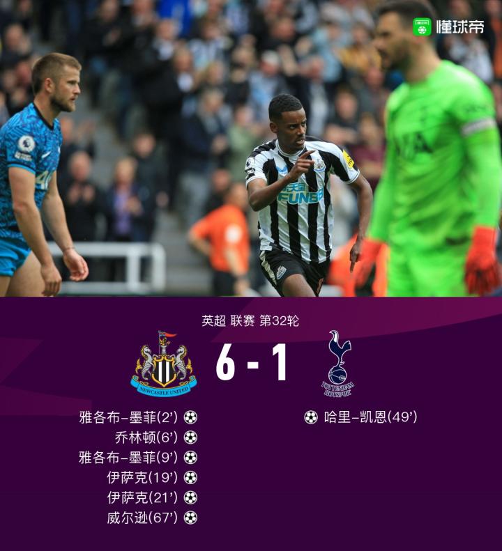 北京时间4月23日21:00,英超第32轮比赛上演一场争四关键战,纽卡斯尔联主场对阵托特纳姆热刺。半场结束,争四之战变惨案,开场后墨菲就先拔头筹,随后乔林顿破门,墨菲不久就完成梅开二度,伊萨克也完成双响;下半场,洛里被换下,凯恩扳回一城,威尔逊破门,最终纽卡6-1狂屠热刺!