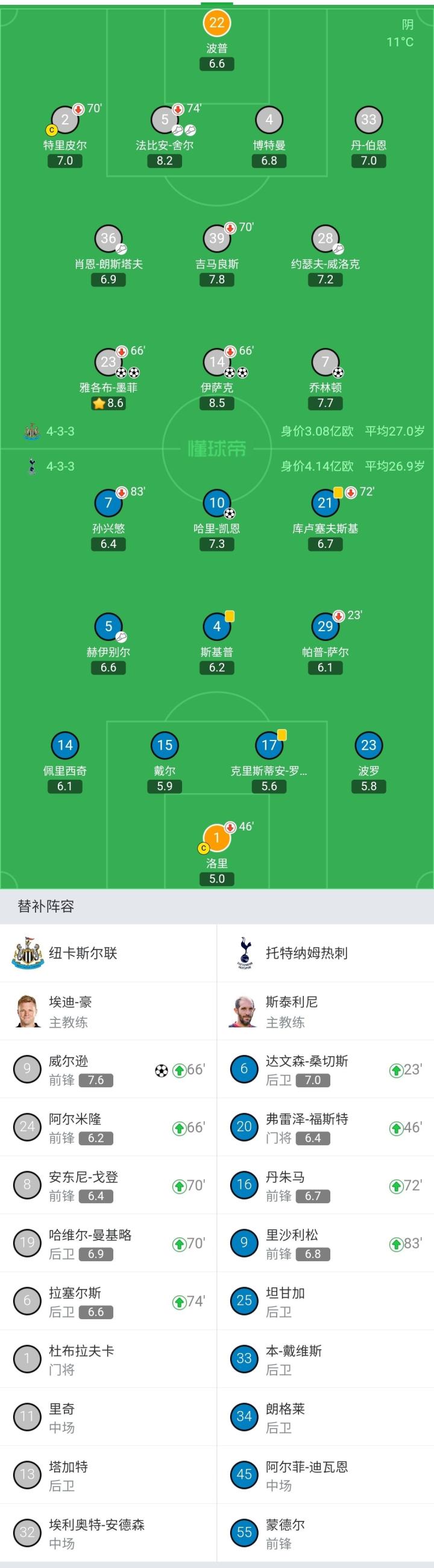 纽卡斯尔联首发:22-波普、2-特里皮尔(70'19-曼基略)、5-舍尔(74'6-拉塞尔斯)、4-博特曼、33-丹-伯恩、36-朗斯塔夫、39-吉马良斯(70'8-戈登)、28-威洛克、23-墨菲(66'24-阿尔米隆)、14-伊萨克(66'9-威尔逊)、7-乔林顿