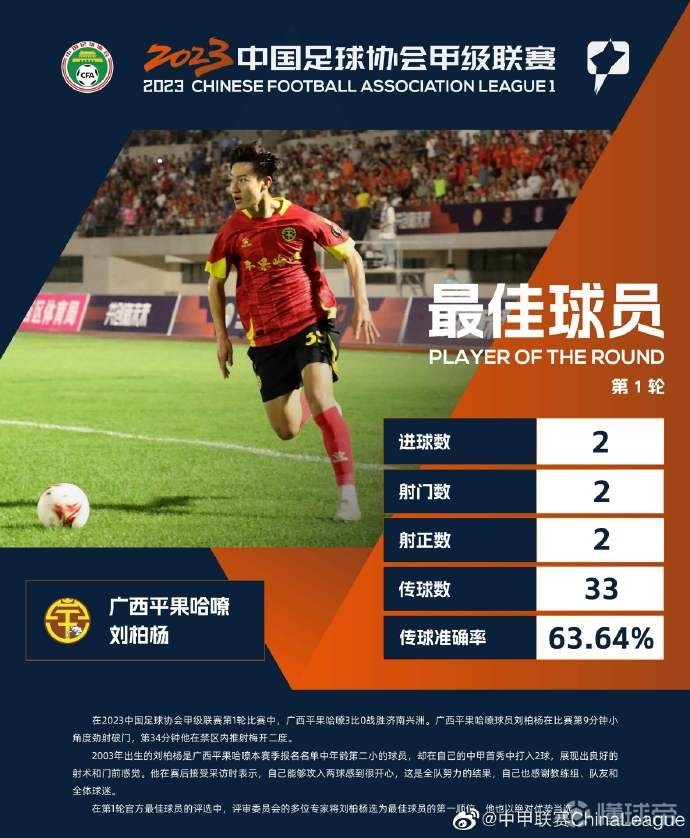 首秀双响,中甲官方:广西平果哈嘹队刘柏杨当选首轮最佳球员