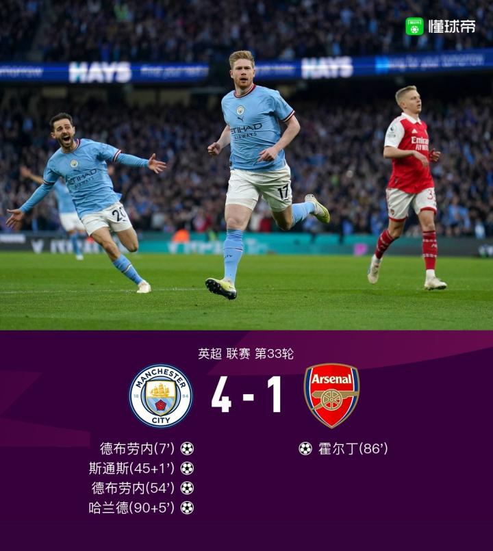 北京时间4月27日03:00,英超第33轮迎来天王山之战,曼城坐镇主场阿提哈德球场迎战阿森纳,本场主裁判为奥利弗。上半场,德布劳内弧线贴地斩破网+助攻斯通斯头槌建功,哈兰德发挥支点作用送助攻+多脚威胁攻门均被拉姆斯代尔化解。下半场,布丁组合继续主宰比赛,哈兰德再度助攻德布劳内破门完成双响后自己读秒阶段又打入一球;霍尔丁劲射为枪手扳回一城。最终,曼城主场4-1赛季三杀+英超12连杀阿森纳,积分榜上少赛2场仅落后对方2分。