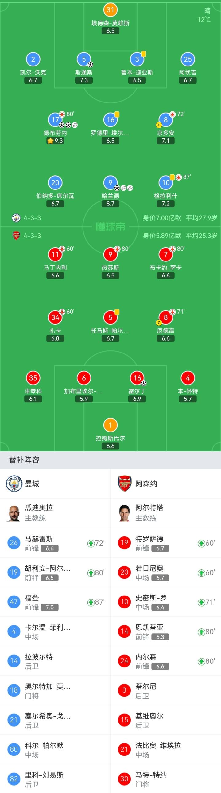 曼城4-1阿森纳,丁丁两射一传,哈兰德两传一射,斯通斯建功
