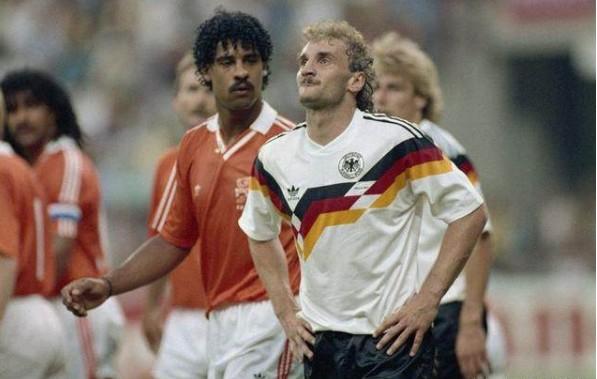 两年后,意大利世界杯,八分之一决赛,这对冤家,再聚米兰城。上半场快结束时,德国人沃勒尔与荷兰人里杰卡尔德起了冲突,先口角,再推搡,终致双双被罚下。哪知,退场时,二人继续对骂,情绪激化,里杰卡尔德一怒之下,朝沃勒尔吐口水,导致被追加停赛,而失去他的橙衣军团,也在下半场连丢两球,最后一比二遭淘汰。