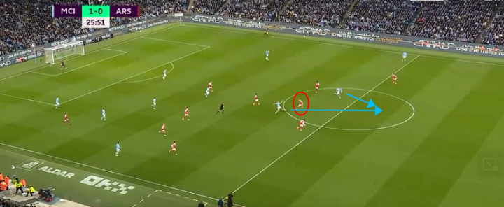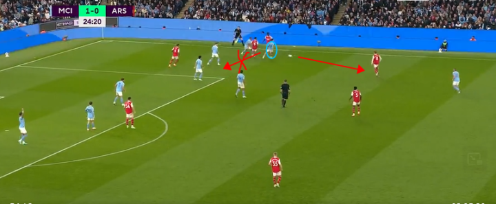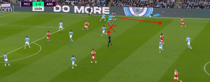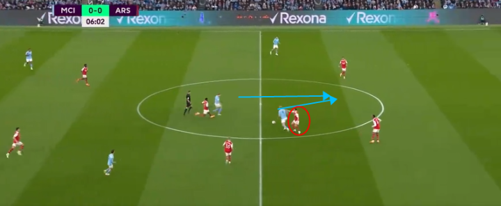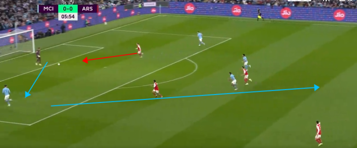 但是这样的布置收效甚微,这其中的原因其实很明显,那就是格拉利什的积极的回防造成了萨卡内切的线路受到了极大的制约,这样的场景在足总杯曼城1-0阿森纳的比赛中也多次出现,当时的阿森纳同样没有想到太多的破局方法。