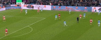 预判到霍尔丁防守的哈兰德在接球过后选择了极其灵巧的处理,哈兰德转身后就直接把球做给了德布劳内,丁丁接球后长驱直入,并且在禁区前沿完成了一脚非常精彩的低射破门。