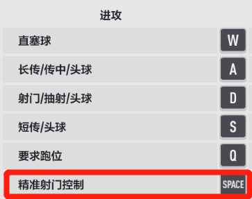 针对键盘玩家,如果觉得常规ZQW不方便同时按,这里分享个小妙招——可以将“精准射门控制”由“Z”键更换成“空格”键,这样有助于同时按出ZQW传中。