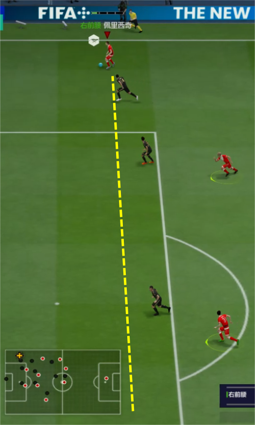 由于ZQW的球速比正常传中略慢,所以在起脚传之前,一定要观察好包抄球员的情况。以传球人为基准画水平线,包抄球员最好距离这条线2-3个身位,这样跟进射门最舒服,具体时机要多实战感受。