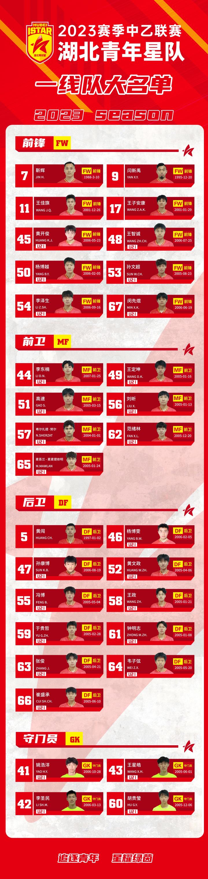 2023赛季中乙联赛湖北青年星一线队大名单