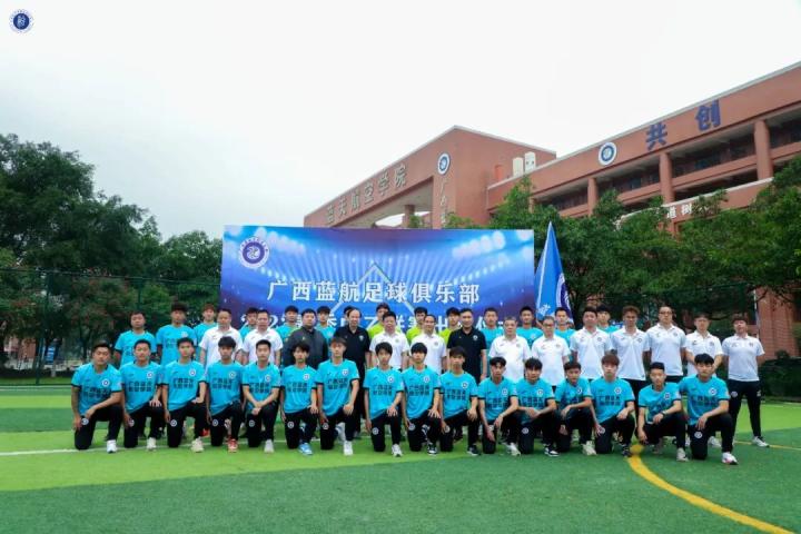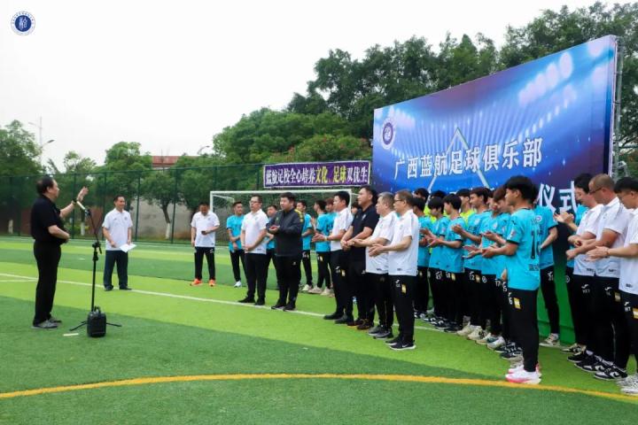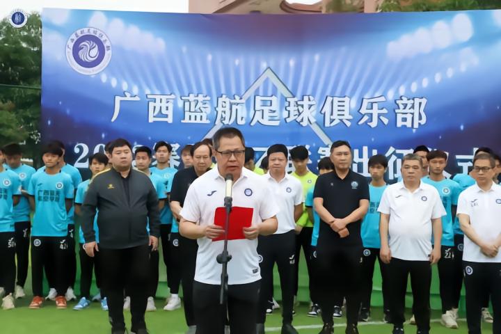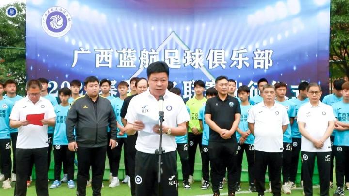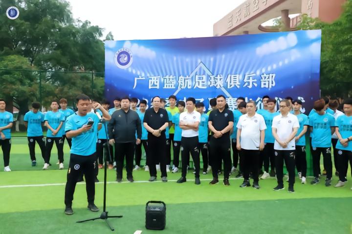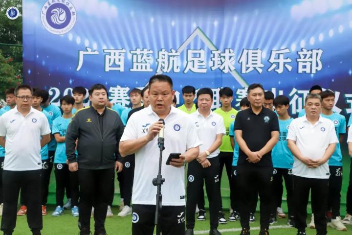 耀武酒肆工作室4月27日上午,广西蓝航足球俱乐部在俱乐部训练基地举行2023赛季中乙联赛出征仪式。广西足球协会主席谢强、秘书长沈轶颉、纪检组副组长李祝,来宾市教育体育局青少科副科长何建安,广西蓝天航空职业学院创始人洪今旭,广西蓝天航空职业学院党委书记谢文斌,广西蓝航足球俱乐部总经理、来宾市蓝航足球学校校长梁显春,来宾市足协主席刘柳谦,广西蓝航足球俱乐部副总经理韦洪广等领导出席活动,广西蓝航足球俱乐部所有梯队教练员及运动员、来宾市蓝航足球学校全体师生也来到现场为参赛队员加油打气。