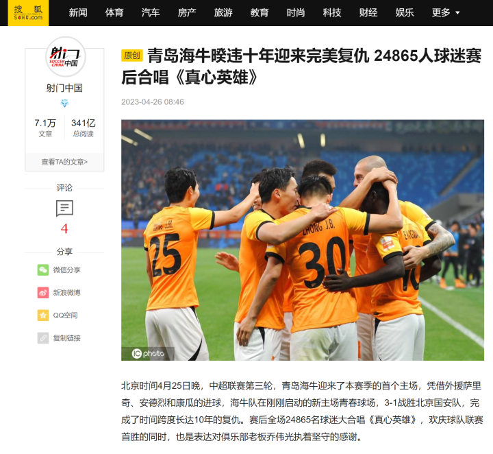 搜狐:青岛海牛暌违十年迎来完美复仇
