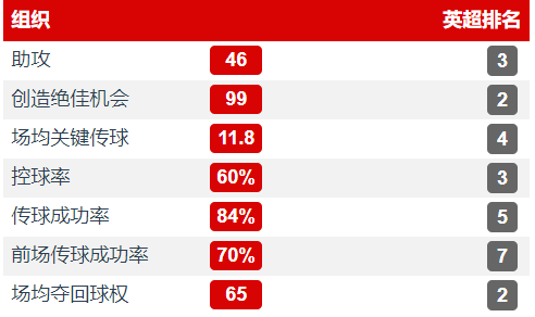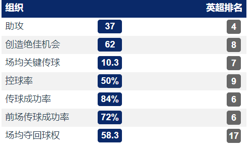 热刺中场在支撑力上的确不够强势,但是在创造机会层面热刺的水平还算是中规中矩的,本坦库尔和比苏马的伤缺在一定程度上对热刺的中场控制力有所影响,霍伊别尔在中后场的拦截也覆盖不到整个中场,斯基普的能力更是值得让人打一个大大的问号,他的诸多失误间接导致了热刺在中场的组织能力较弱,波罗和佩里西奇要去插上进攻,所以在中场的回撤上可能也不好及时到位,热刺的中路中场整体推进能力和中前场衔接能力确实有待加强,不过两个边前卫的前插进攻还是可圈可点的。在另一项数据来看,热刺的前场夺回球权数据很低,这也就导致热刺在丢球后不能及时抢断会造成防守威胁,同时并没有足够的反击机会,反击机会不够可能对于进攻线的发挥也会有不小的影响,这一点是需要改善的。