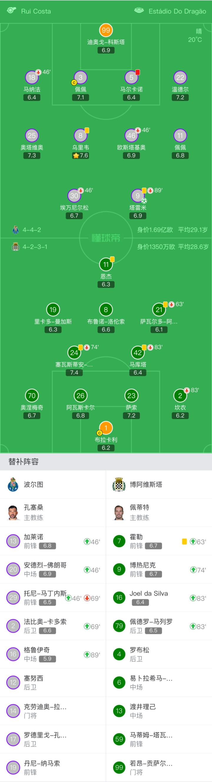 波尔图首发:99-迪奥戈-科斯塔、18-马纳法(46'13-加莱诺)、3-佩佩、5-马尔卡诺、22-温德尔、8-乌里韦、25-奥塔维奥、11-佩佩、46-欧斯塔基奥(46'20-安德烈-弗朗哥)、30-埃万尼尔松(46'29-托尼-马丁内斯)(69'2-法比奥-卡多索)、9-塔雷米(89'16-格鲁伊奇)
