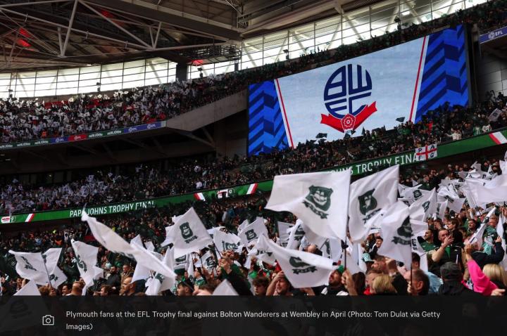 【4 月在温布利举行的 EFL 奖杯决赛对阵博尔顿流浪者队的普利茅斯球迷(照片:Tom Dulat 来自 Getty Images)】