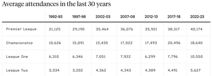 如果有机会,这个人数会更高。 阿森纳、埃弗顿、利兹联、利物浦和曼联等俱乐部的季票等候名单很长,而英超俱乐部将客场门票定为 30 英镑的普遍需求从未减少。 这与 1992-93 赛季英超联赛的首个赛季相去甚远,当时顶级联赛的平均观众人数为 21,125 人,几乎是本赛季的一半。