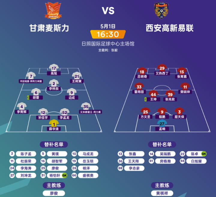 甘肃麦斯力主教练廖俊安排胡蕾担任队长,薛华清司职门将,边成、木拉地里、高旭、李梓辰等球员首发登场。主帅廖俊依然以球员身份出现在替补席。