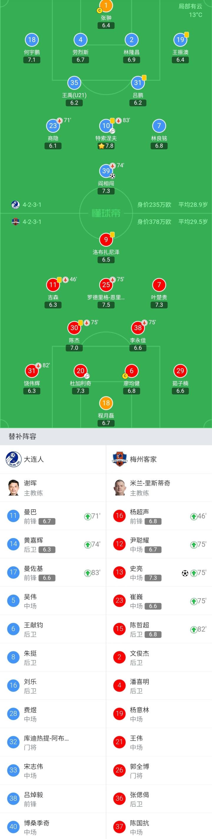 梅州客家首发:18-程月磊、29-茹子楠、6-廖均健、20-杜加利奇、31-饶伟辉(82'15-陈哲超)、38-李永佳(75'13-史亮)、30-陈杰(75'23-崔巍)、7-叶楚贵、25-罗德里格(75'12-尹聪耀)、11-吉森(46'16-杨超声)、9-洛布扎尼泽