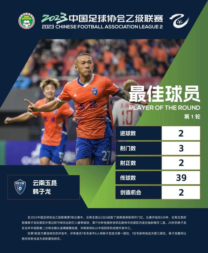 北京时间5月3日,中乙联赛官方公布了新赛季中乙联赛第1轮最佳球员,梅开二度的云南玉昆球员韩子龙当选。
