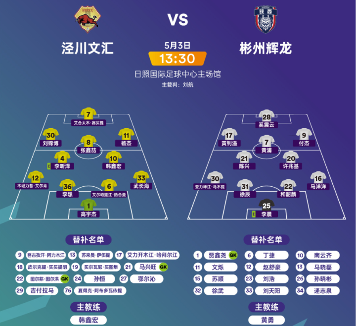 泾川文汇理论上还有争夺小组第2的机会,所以主帅韩鑫宏尽遣主力登场,他本人也身披10号战袍,出现在首发阵容中。李昕泽担任场上队长,高宇杰司职门将,杨杰、张鑫喆、李想、艾合太木等球员也首发登场。