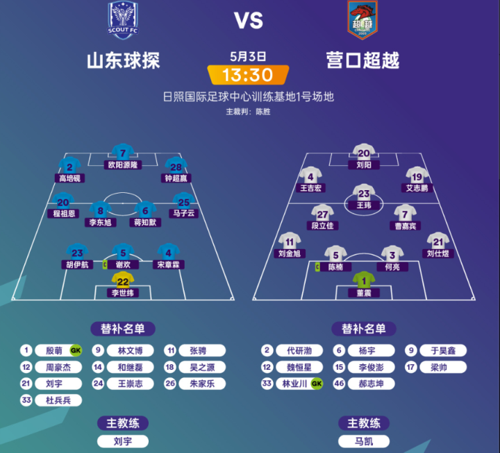 山东球探主教练刘宇安排谢欢担任队长,李世纬司职门将,欧阳源隆、李东旭、程祖恩、蒋知默等球员联袂首发。
