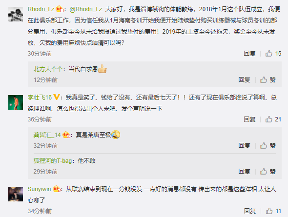 (华昆接手后的淄博队官微评论区几乎变成了前球员们的讨薪大会)