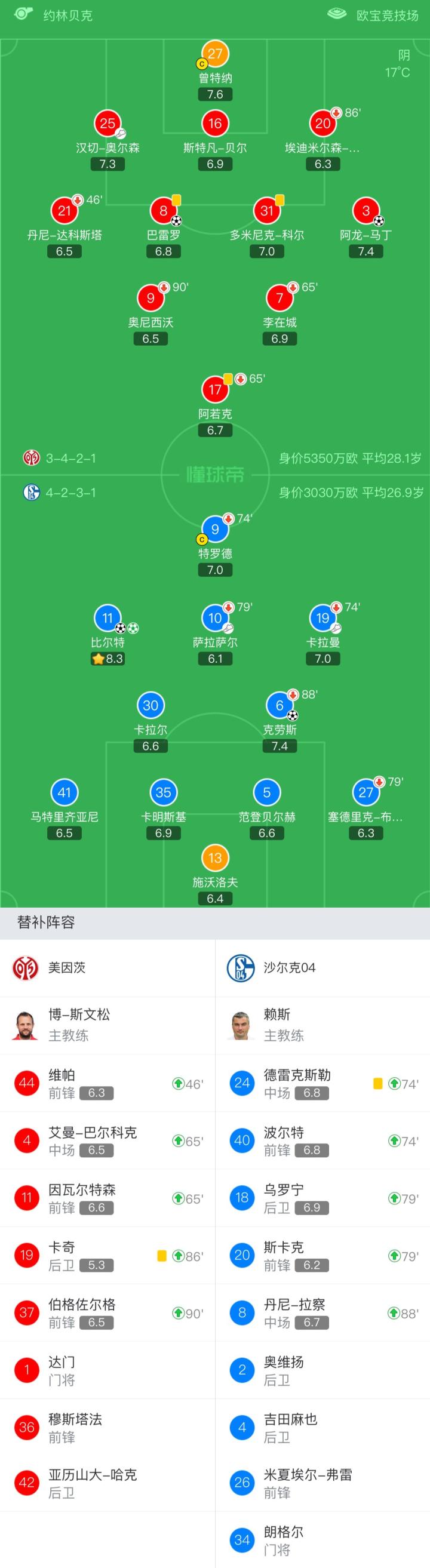 沙尔克04首发:13-施沃洛夫、41-马特里齐亚尼、35-卡明斯基、5-范登贝尔赫、27-塞德里克-布伦内尔(79'18-乌罗宁)、30-卡拉尔、6-克劳斯(88'8-丹尼-拉察)、11-比尔特、10-萨拉萨尔(79'20-斯卡克)、19-卡拉曼(74'24-德雷克斯勒)、9-特罗德(74'40-波尔特)