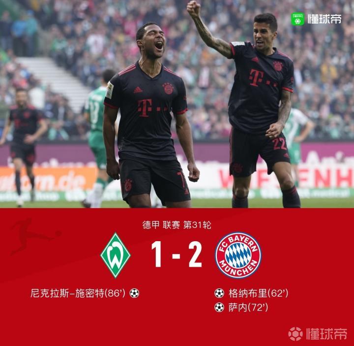 【拜仁2-1不莱梅,格纳布里破僵,萨内替补建功,施密特穿云箭】