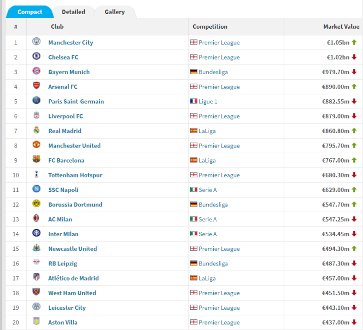 全球足球俱乐部身价排行,英超BIG6齐进前十