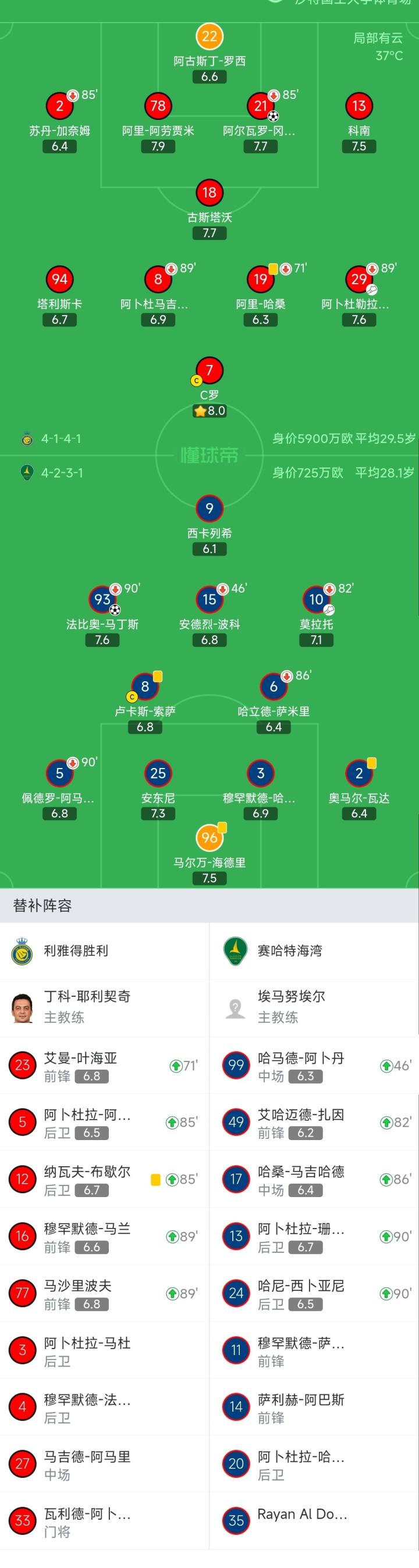 利雅得胜利首发:22-阿古斯丁-罗西、2-苏丹-加奈姆(85′12-纳瓦夫-布歇尔)、21-阿尔瓦罗-冈萨雷斯(85′5-阿卜杜拉-阿姆里)、78-阿里-阿劳贾米、13-科南、18-古斯塔沃、19-阿里-哈桑(71′23-艾曼-叶海亚)、8-苏莱希姆(89′77-马沙里波夫)、29-阿卜杜勒拉赫曼-加里卜(89′16-穆罕默德-马兰)、94-塔利斯卡、7-C罗