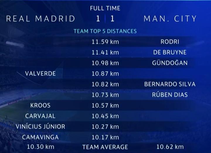 在本场比赛的跑动距离统计中,排名前三的全都是曼城球员,他们分别是罗德里、德布劳内和京多安,而前六名中也只有费德里科-巴尔韦德一名皇马球员。