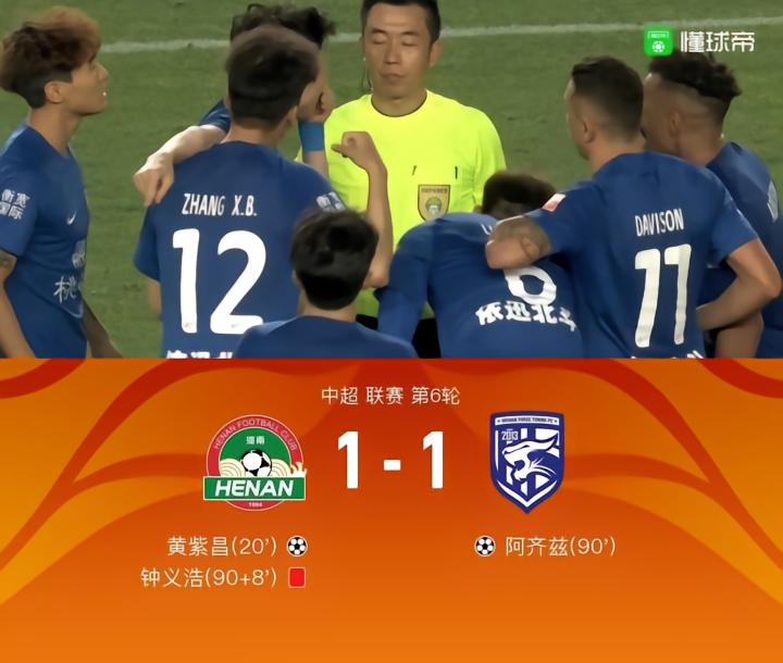 【河南1-1三镇一胜难求,阿齐兹绝平,黄紫昌破门,钟义浩直红】