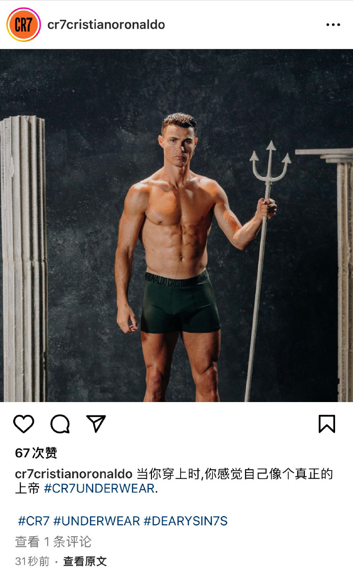 C罗宣传个人品牌CR7内裤,自己做模特代言