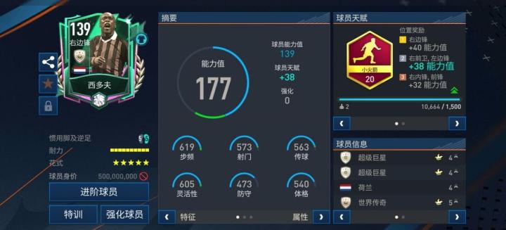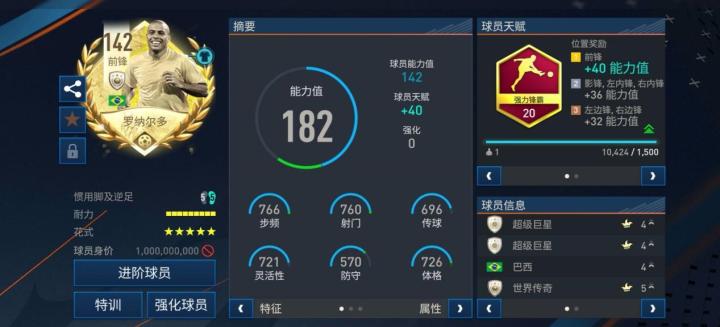 ○ 游戏中,罗纳尔多推出的最具代表性的一张球员卡就是此前世界杯活动的世界杯传奇版本。这张球员卡基础能力值为142,天赋配备了强力锋霸。