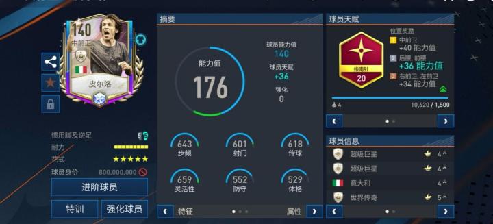 ○ 游戏中,皮尔洛在欧冠活动中推出了一张基础能力值140的传奇版本,天赋配备了指南针。