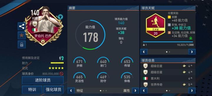 ○ 游戏中,巴乔推出的最具代表性的一张球员卡是世界杯传奇版本,基础能力值140的他司职前腰,天赋配备了艺术家。