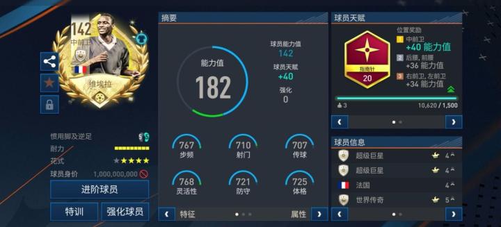 ○ 游戏中,维埃拉推出的最具代表性的一张球员卡也是此前世界杯活动的世界杯传奇版本。这张维埃拉基础能力值为142,天赋配备了指南针。实战中,维埃拉在攻守两端的贡献都非常大,表现极为全面。