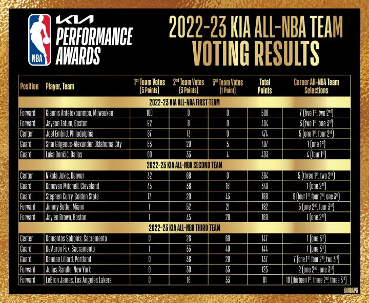 NBA最佳阵容:恩比德、字母哥一阵,库里二阵,詹姆斯三阵